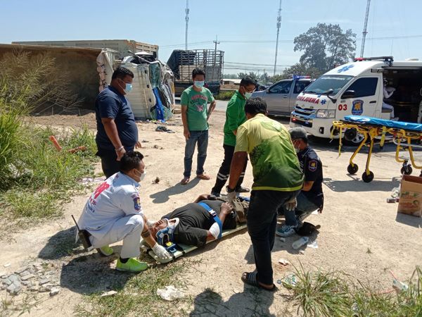 อายุ 32 ปี เจ็บปวดขาทั้งสองข้าง ส่วนคู่กรณีเป็นรถพ่วง 18 ล้อ บรรทุกทราย ยี่ห้ออีซูซุ ทะเบียนส่วนหัว 73-8250 ชลบุรี ทะเบียนส่วนหาง73-8251 ชลบุรี พลิกคว่ำขวางถนนทรายกองเกลื่อนพื้น โดยมีนายอุดม มีมั่ง อายุ 39 ปี เป็นคนขับ นอนได้รับบาดเจ็บขาติดอยู่ภายในรถ ทางเจ้าหน้าที่กู้ภัยฯช่วยกันงัดจนช่วยเหลือออกมาได้ จากนั้นนำตัวผู้บาดเจ็บทั้ง 2 รายเร่งรัดส่งโรงพยาบาลใกล้เคียง