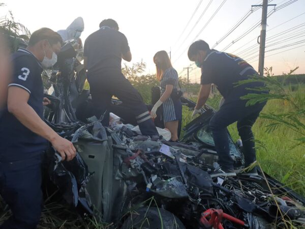 ที่เกิดเหตุพบรถยนต์กระบะ ยี่ห้อ nissan navara สีดำ ทะเบียน ผม 8477 ระยอง เสียหลักพุ่งตกข้างถนน ตัวรถพังยับเยิน ภายในรถยังพบนายเพราพงศ์พันธุ์ กาญแก้ว อายุ 24 ปี ขาถูกคอนโซลรถอัดติด ทางเจ้าหน้าที่กู้ภัยฯใช้อุปกรณ์เครื่องตัดถ่างเร่งรัดช่วยเหลือนำตัวผู้บาดเจ็บออกมาได้ ตรวจสอบได้รับบาดเจ็บเล็กน้อย บนถนนข้างทางยังพบรถบรรทุกตู้ 6 ล้ม ยี่ห้อ isuzu ทะเบียน 67-4741 กรุงเทพมหานคร ด้านท้ายรถถูกเฉี่ยวชน โดยมีนายเสกสรรค์ นาหัวคน อายุ 38 ปี เป็นคนขับยืนรอให้การอยู่ในที่เกิดเหตุ