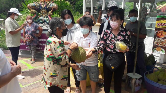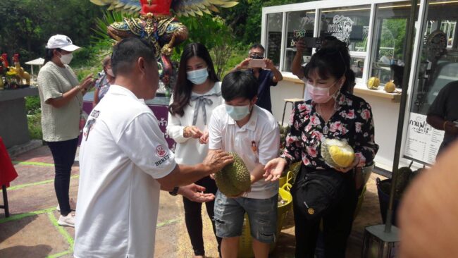 เจ้าของวันเกิดและเจ้าของกิจการเพจทุเรียนออนไลน์ชื่อดังแจกทุเรียนฟรี500กิโลกรัม เนื่องจากวันคล้ายวันเกิดบริเวณหน้าลานบูชาท้าวเวสสุวรรณวัดเกาะเปริด