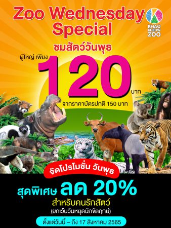 (วันที่ 19 พ.ค.65) นายเทวินทร์ รัตนะวงศะวัต ผู้อำนวยการสวนสัตว์เปิดเขาเขียว เปิดเผยว่า สวนสัตว์เปิดเขาเขียวได้จัดกิจกรรมส่งเสริมการท่องเที่ยวในช่วงวันธรรมดา สไตล์ New Normal ลดความแออัดผลักดันให้การท่องเที่ยวมีการกระจายตัวไปยังวันธรรมดามากยิ่งขึ้น ภายใต้ชื่อ Zoo Wednesday Special ด้วยการรับส่วนลด20% ค่าเข้าชมสัตว์วันพุธ ผู้ใหญ่เพียง 120 บาท จากราคาบัตรปกติ 150 บาท (ยกเว้นวันหยุดนักขัตฤกษ์)
