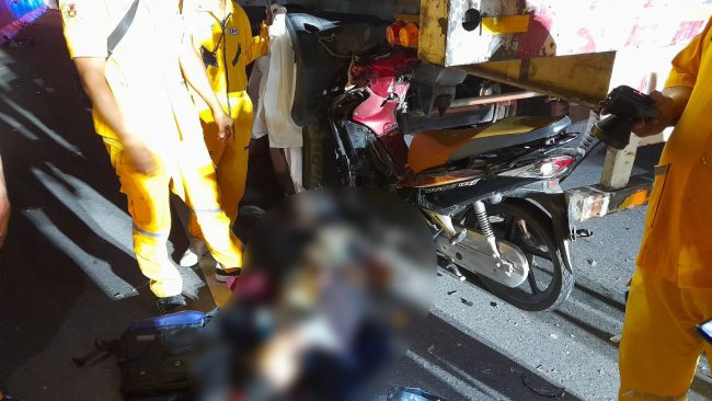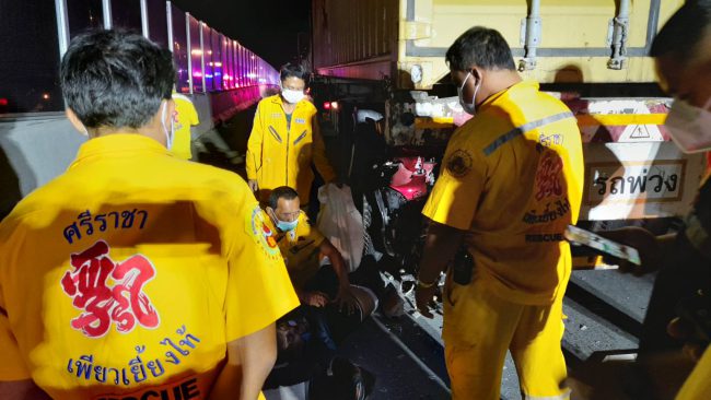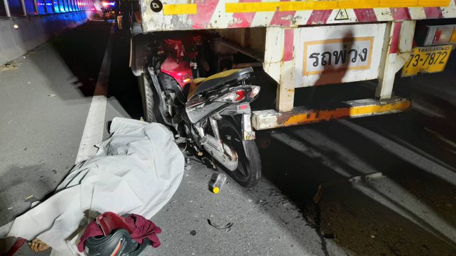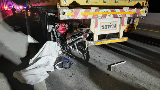 หนุ่มวัย 28 ปี ขี่จยย.พุ่งชนท้ายรถพ่วง18ล้อที่จอดเสียอยู่บนสะพานเสียชีวิตคาที่