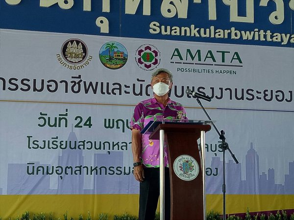 เมื่อเวลา10.00น.(24พ.ค.2565) ที่อาคารโดมโรงเรียนสวนกุหลาบวิทยาลัย ชลบุรี ตำบลบ่อวิน อำเภอศรีราชา จังหวัดชลบุรี นายวิบูลย์ กรมดิษฐ์ ในฐานะผู้บริหารนิคมอุตสาหกรรมอมตะซิตี้ ระยอง ได้ให้การต้อนรับ นายชาญนะ เอี่ยมแสง ผู้ว่าราชการจังหวัดระยอง,นายสมมาตร อนันต์ธราทรัพย์ จัดหางานจังหวัดระยอง,นายอภิชาติ เสกธีระ ผู้อำนวยการสำนักงานนิคมอุตสาหกรรมอมตะซิตี้ ระยอง,นายชัยพร แพภิรมย์รัตน์ นายอำเภอปลวกแดง และได้กล่าวรายงานว่า ยินดีต้อนรับทุกท่านที่มาร่วมงาน “เส้นทางมหกรรมอาชีพและนัดพบแรงงานระยอง ประจำปี 2565” ในวันนี้ ซึ่งนับเป็นเรื่องที่ดี ที่เราทุกภาคส่วนได้กลับมาร่วมกันจัดงานนี้ขึ้นอีกครั้ง หลังจากที่ได้เว้นช่วงการจัดงานไปนานถึง 2 ปี เนื่องจากสถานการณ์การแพร่ระบาดของเชื้อไวรัสโควิด-19 และการกลับมาจัดงานในครั้งนี้ อมตะยังคงมีส่วนร่วมสนับสนุนการสร้างโอกาสให้พี่น้องประชาชนที่ต้องการหางานทำ และนายจ้าง