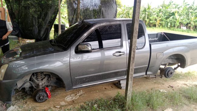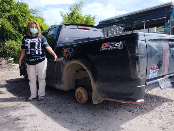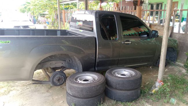 พบ กระบะแค็บ ยี่ห้ออีซูซุ สีดำ หมายเลขทะเบียน ยง-5749 เชียงใหม่ ถูกถอดล้อแม็กซ์ พร้อมยาง ทั้ง 4 ล้อ โดยมีน.ส.เด่นนภา หล้าแหล้ อายุ32ปี อยู่บ้านเลขที่238 ม.5 ต.เอราวัณ อ.เอราวัณ จ.เลย เป็นเจ้าของรถยนต์กระบะ เปิดเผยว่า ตนเองเป็นพนักงานมาเช่าห้อง บริเวณที่เกิดเหตุ ซึ่งทุกวันจะนำรถมาจอดบริเวณนี้ หลังจากเลิกงานพอเช้าก็ขับไปทำงานพบว่าล้อรถยนต์ทั้งสี่ล้อได้ถูกขโมยไปจึงรีบไปแจ้งความ ตนเองก็รู้สึกตกใจมากกับเหตุการณ์ที่เกิดขึ้น เพราะก่อนหน้านี้เคยได้ยินเรื่องโดนขโมยล้อแถวในเครือสหพัฒน์หลายคันแต่ก็ไม่เคยได้คิดว่าเข้ามาจะเกิดขึ้นกับตนเอง