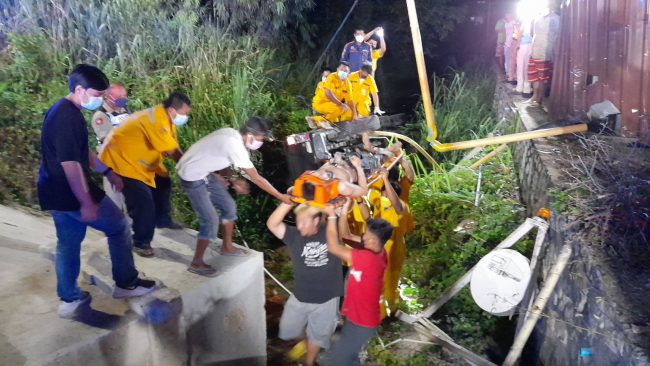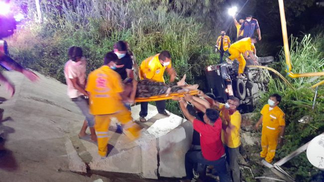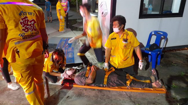 ซึ่งการช่วยเหลือเป็นไปด้วยความทุลักทุเลเนื่องจากรถตะแคง ซึ่งใช้เวลากว่า20นาทีจึงนำร่างของนายณัฐพงษ์ ป้อมวัฒนา อายุ36ปี ออกมาจากรถได้ในสภาพเมาสุดสุดกลิ่นสุราคลุ้ง ไม่สวมเสื้อ สวมกางเกงขายาวลายพลาง พูดจาไม่ค่อยรู้เรื่อง โดยบาดเจ็บจุกที่หน้าอก ศีรษะปวดบวมเนื่องจากแรงกระแทกรุนแรง หลังจากปฐมพยาบาลเสร็จสิ้น จึงรีบนำส่งโรงพยาบาลสมเด็จพระบรมราชเทวี ณ ศรีราชา ให้แพทย์ทำการรักษาต่อไป ซึ่งทางเจ้าหน้าที่ตำรวจ ได้ตรวจสอบสถานที่เกิดเหตุ พบว่ารถกระบะได้พุ่งแหกโค้ง333มา30เมตรแล้วพุ่งชนคนนั่งคล่อมรถจยย.ที่จอดอยู่ริมถนนหน้าบล็อคยาม แล้วเสียหลักพุ่งตกไปในลำห้วยดังกล่าว ซึ่งต้องรอผู้บาดเจ็บทั้ง2คนออกจากโรงพยาบาลก่อนจึงจะสอบสวนหาสาเหตุที่แท้จริงอีกครั้ง