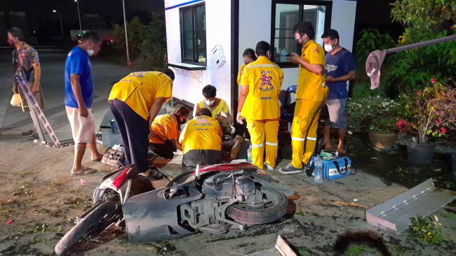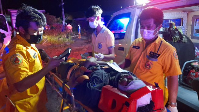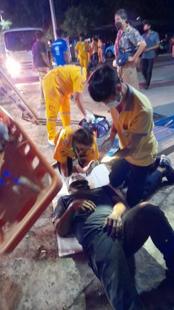 ชื่อนายนิกร กลิ่นนวล อายุ42ปี ได้รับบาดเจ็บตามลำตัวและศีรษะ ได้บอกว่านั่งคล่อมรถจยย.ยี่ห้อยามาฮ่าGT125สีแดง หมายเลขทะเบียน 3กต-8506 ชลบุรี ริมถนนเพื่อรอเพื่อนเลิกงาน ทางอาสาบรรเทาสาธารณภัยและอุบัติภัยฯได้ช่วยกันปฐมพยาบาลทำบาดแผล ก่อนรีบนำส่งโรงพยาบาลแหลมฉบังให้แพทย์ทำการรักษาต่อไป ส่วนอีกรายในรถกระบะที่พุ่งตกลำห้วยนั้นต้องรอเจ้าหน้าที่การไฟฟ้าศรีราชามาตัดไฟออกก่อนเนื่องจากเกี่ยวสายไฟลงไปด้วย ทางอาสาบรรเทาสาธารณภัยและอุบัติภัยฯกลัวเกิดอันตรายจากไฟฟ้ารั่วไหล หลังจากเจ้าหน้าที่การไฟฟ้ามาตัดไฟที่หม้อแปลงไฟฟ้าแล้วทางอาสาบรรเทาสาธารณภัยและอุบัติภัยพุทธสมาคมเพียวเยี้ยงไท้ศรีราชา จึงนำกำลังลงไปช่วยเหลือคนขับรถกระบะยี่ห้ออีซุซุ ออนิว สีดำ หมายเลขทะเบียน กง-6761 สุโขทัย ที่พลิกตะแคงอยู่ในลำห้วย