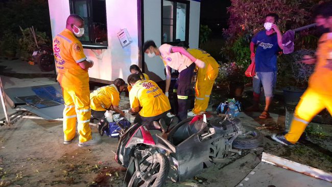 เมื่อเวลา21.00น.วันที่26พ.ค.2565 ร.ต.อ.แดนศักดิ์ พูลดี รองสว.เวรสภ.หนองขาม ได้รับแจ้งรถกระบะแหกโค้งพุ่งชนคนคล่อมรถจยย.อยู่ริมถนนจนบาดเจ็บและรถกระบะเสียหลักพุ่งตกไปในลำห้วยคนขับได้รับบาดเจ็บ หลังรับแจ้งจึงประสานอาสาบรรเทาสาธารณภัยและอุบัติภัยพุทธสมาคมเพียวเยี้ยงไท้ศรีราชา ไปร่วมตรวจสอบที่เกิดเหตุโค้งตอง333 หน้าบริษัทวินวินด์ทรานสปอร์ต จำกัด เลขที่333/25 ต.หนองขามอ.ศรีราชาโดยพบผู้บาดเจ็บ1รายที่คล่อมรถจยย.แล้วถูกรถกระบะเฉี่ยวได้รับบาดเจ็บหน้าบล็อคยาม