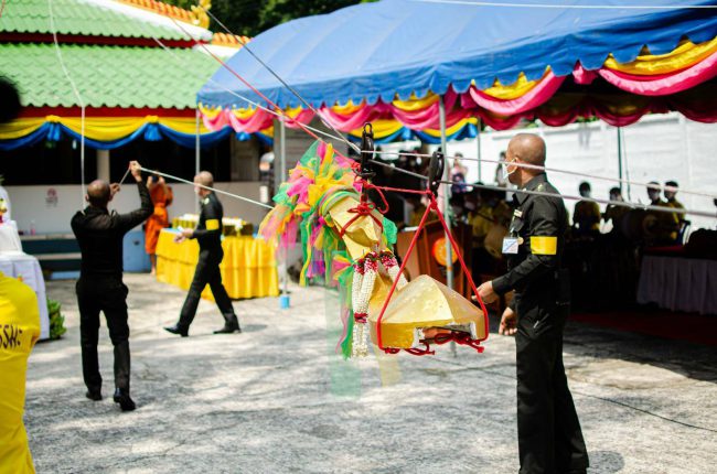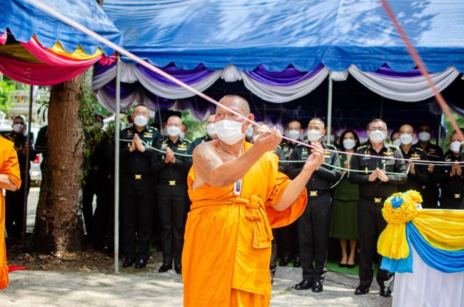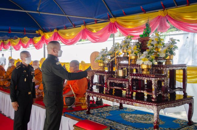 การนี้ พระราชเวที เจ้าคณะภาค 12 ประธานสงฆ์ ประกอบพิธีเจิมช่อฟ้าและปิดทอง พลเอก ณรงค์พันธ์ จิตต์แก้วแท้ พร้อมภริยา เป็นประธานผูกผ้าสามสี ปิดทองและคล้องพวงมาลัยที่ช่อฟ้า จากนั้นประกอบพิธียกช่อฟ้าขึ้นสู่ยอดศาลาการเปรียญ สำหรับพิธีการยกช่อฟ้า ถือว่าเป็นพิธีสำคัญเนื่องจากเป็นการยกส่วนบนสุดของศาลา หากใครได้ร่วมบุญยกช่อฟ้าแล้ว นับว่าเป็นมหากุศลอย่างยิ่ง จะทำให้ชะตาชีวิตสูงส่ง ไม่ตกต่ำ มีจิตใจใฝ่ดี ใฝ่ความก้าวหน้า มีเกียรติ มีความสง่างาม ดังนั้นการร่วมสร้างศาลาการเปรียญและยกช่อฟ้านั้น เชื่อว่าผู้ทำจะได้อานิสงส์มาก เพราะถือว่าถวายเป็นพุทธบูชา และเป็นการสืบทอดพระพุทธศาสนาให้ดำรงอยู่สืบไป