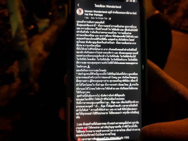 ด้านเจ้าหน้าที่กิจการพิเศษเมืองพัทยา เปิดเผยว่าหลังรับแจ้งจากประชาชนว่ามีบุคคลโพสต์เฟสบุ๊กตัดพ้อ เกรงว่าจะเป็นอันตราย จึงนำกำลังออกติดตามหา จากรูปภาพที่ทางผู้โพสต์นั้นปรากฏสุดท้ายอยู่ที่ บริเวณหัวแหลมบาลีฮายใกล้เคียงประภาคาร แต่ก็ไม่ทันเสียแล้ว เมื่อพบว่าผู้โพสต์ ได้ตัดสินใจผูกคอตายกับต้นไม่ไปเสียแล้วจึงรีบประสานเจ้าหน้าที่ตำรวจเข้าตรวจสอบดังกล่าว