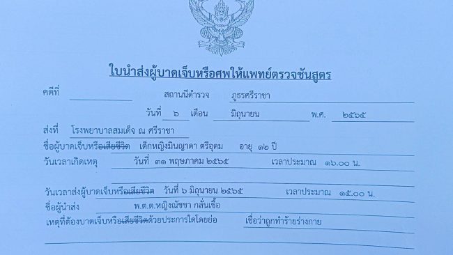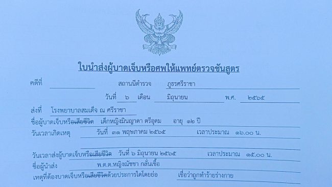 พ่อแม่พาลูกสาว ป6 หอบหลักฐาน ร้องทุกข์ตำรวจศรีราชา หลังถูกครูประจำชั้น ลงโทษสก็อตจั๊มพ์ จนเข้าโรงพยาบาล 6 วัน