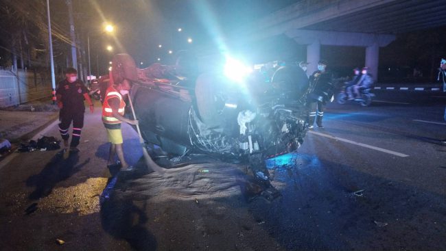 ที่เกิดเหตุประชาชนมุงดูเหตุการณ์เป็นจำนวนมาก พบรถยนต์กระบะ ยี่ห้อ มิสซูบิชิ สีดำ หมายเลขทะเบียน ข4332 ชลบุรี เสียหลักชน เสาไฟฟ้า ก่อนตีลังกาพลิกคว่ำล้อชี้ฟ้า ตัวรถได้รับความเสียหายยับเยิน มีนายปรีดา วัฒนปัญโญ อายุ 34 ปี เป็นคนขับ และภรรยาได้รับบาดเจ็บ เจ้าหน้าที่กู้ภัยฯปฐมพยาบาลเบื้องต้น