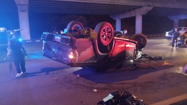 ชลบุรี-กระบะป้ายแดงเสียหลักชนเสาตีลังกาล่อชี้ฟ้า
