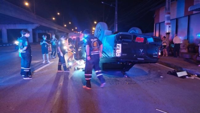 เมื่อเวลา 23.30 น.วันที่ 11 มิถุนายน 2565 ศูนย์วิทยุ หน่วยวิทยุหน่วยกู้ภัยสว่างบริบูรณ์ธรรมสถานเมืองพัทยา จ.ชลบุรี รับแจ้งอุบัติเหตุรถยนต์กระบะเสียหลักพลิกคว่ำ มีผู้ได้รับบาดเจ็บ เหตุเกิดที่ บนถนนสุขุมวิท บริเวณ แยกกระทิงลาย ต.บางละมุง อ.บางละมุง จ.ชลบุรี หลังรับแจ้งจึงรีบนำกำลังเจ้าหน้าที่กู้ภัยสว่างบริบูรณ์ธรรมสถานเมืองพัทยารีบไปตรวจสอบ