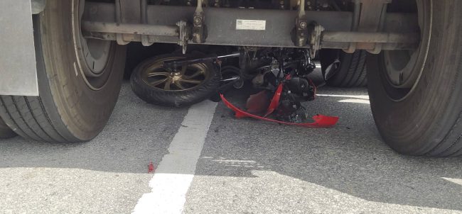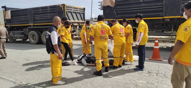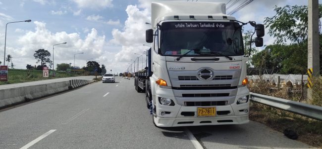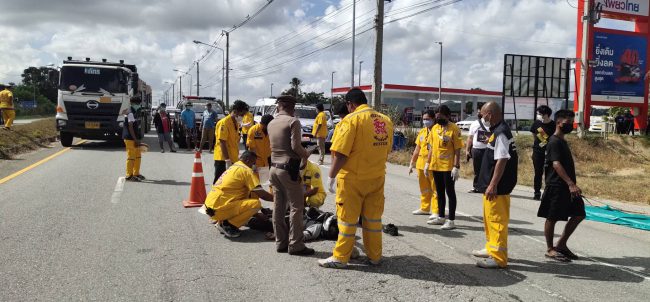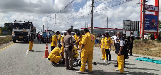หนุ่มโรงงานออกกะกำลังกลับบ้านเสยท้ายรถบรรทุกที่ออกจากปั๊มน้ำมัน ร่างกระเด็นดับสลด