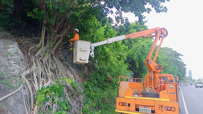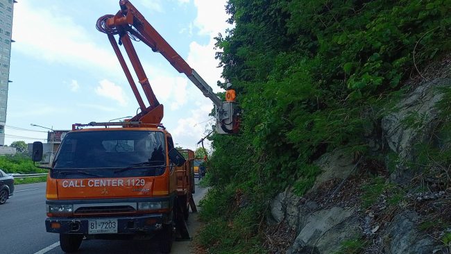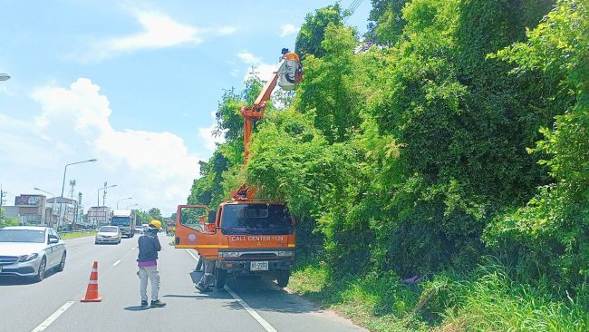 ซึ่งทางเจ้าหน้าที่ต้องใช้รถกระเช้า เข้าดำเนินตัดกิ่งไม้และเก็บเศษกิ่งไม้ ประกอบด้วยช่วงนี้เข้าสู่ฤดูฝนและลมกระโชกแรงอาจทำให้ต้นไม้หล่นดับรถยนต์ที่สัญจรไปมา เพื่อป้องกันอุบัติเหตุอาจเกิดขึ้นได้