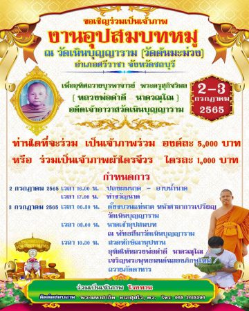 เวลา12.00น. วันที่17 มิ.ย.65 พระมหาสาธิต อาภัสสโร เจ้าอาวาสวัดเนินบุญญาราม(วัดต้นมะม่วง) ต.ทุ่งสุขลา อ.ศรีราชา จ.ชลบุรี ได้เปิดเผยว่า ทางวัดเนินบุญญาราม(ต้นมะม่วง) ได้เปิดรับสมัครชายไทย อายุ 20 ปีบริบูรณ์ มาร่วมบวชฟรีที่วัดเพื่ออุทิศถวายบูรพาจารย์ หลวงพ่อคำดี อดีตเจ้าอาวาสวัดเนินบุญญาราม ในวันที่ 2-3 กรกฏาคม 2565 ซึ่งผู้สนใจสามารถเดินทางมาสมัครบวชได้ที่วัดเนินบุญญาราม(ต้นมะม่วง) ทุกวัน มาพูดคุยกันว่าจะบวช 7 วัน หรือ 10 วัน หรือบวชทดแทนพระคุณ บิดา-มารดา ระยะ 1 พรรษา ก็สามารถมาบวชกันได้ หรือท่านใดจะร่วมเป็นเจ้าภาพร่วมบวชพระในครั้งนี้ ก็สามารถร่วมบุญได้องค์ละ 5,000 บาท หรือร่วมเป็นเจ้าภาพไตร จีวร ไตรละ 1,000 บาท โดยกำหนดการบวชหมู่ ในวันที่ 2 ก.ค.เวลา 16.00น. ปลงผมนาค-อาบน้ำนาค เวลา 17.00 น.ทำขวัญนาค วันที่ 3 ก.ค. เวลา 06.30น.ตั้งขบวนแห่นาค เวลา 08.00น.นำนาคเข้าอุปสมบท ที่อุโบสถวัดเนินบุญญาราม เวลา10.30น.สวดทักษิณานุปทาน อุทิศให้หลวงพ่อคำดี และเจริญพระพุทธมนต์ ฉลองพระภิกษุใหม่และถวายภัตราหารเพล