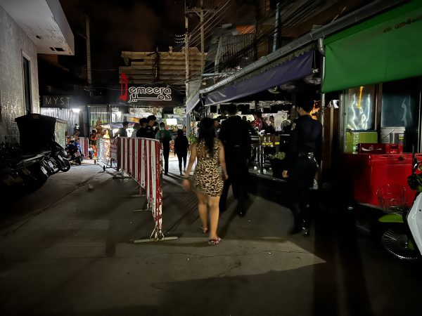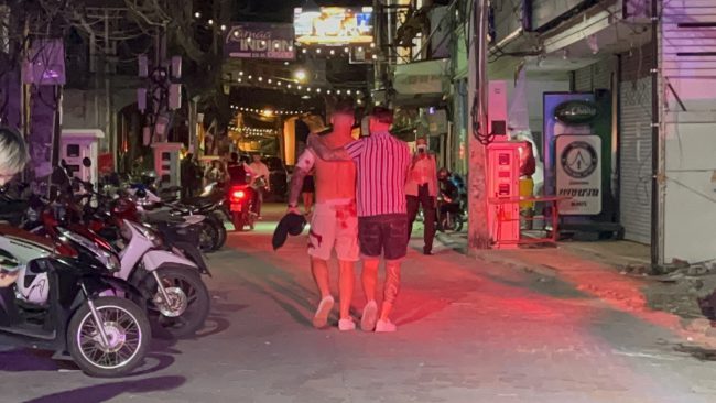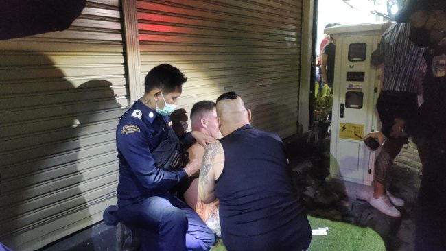 เมื่อไปตรวจสอบมีนักท่องเที่ยวแตกตื่นตกใจกับเหตุการณ์ที่เกิดขึ้น พบนักท่องเที่ยวชาวต่างประเทศ มีบาดแผลถูกของมีคมเข้าที่แขนทั้งสองข้าง เจ้าหน้าที่กู้ภัยฯปฐมพยาบาลเบื้องต้น โดยมีเจ้าหน้าที่ และการ์ดของสถานบันเทิงใกล้เคียง ค่อยกันห้ามไม่ให้ผู้ที่เกี่ยวข้องเข้าไปใกล้ผู้บาดเจ็บ พร้อมสั่งห้ามบันทึกภาพ แต่ผู้บาดเจ็บไม่ยอมไปโรงพยาบาลกับเจ้าหน้าที่ ก่อนจะเดินแยกกลับไปกับเพื่อน