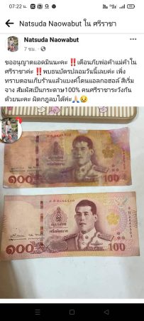 มีผู้ใช้เฟสบุ๊คขออนุญาตแอดมินนะคะ ‼️เตือนภัยพ่อค้าแม่ค้าในศรีราชาค่ะ ‼️พบธนบัตรปลอมวันนี้เลยค่ะ เพิ่งทราบตอนเก็บร้านแล้วแบงค์โดนแอลกอฮอล์ สีเริ่มจาง สัมผัสเป็นกระดาษ100% คนศรีราชาระวังกันด้วยนะคะ ผิดกฎลบได้ค่ะ🙏🏻😢