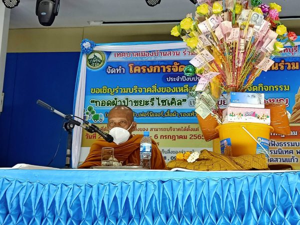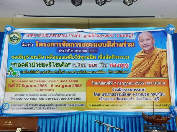# เวลา 08.30 นาฬิกา วันพฤหัสบดีที่ 7 กรกฎาคม พ.ศ.2565 ณ ศาลาประชาคมเทศบาลเมืองบ้านสวน อำเภอเมืองชลบุรี จังหวัดชลบุรี เทศบาลเมืองบ้านสวน ร่วมกับ มูลนิธิวัดสวนแก้ว จังหวัดนนทบุรี ดำเนินโครงการจัดการขยะแบบมีส่วนร่วม ประจำปี พ.ศ.2565 โดยมี นายชัยเดช ชิตวิเศษ รองนายกเทศมนตรีเมืองบ้านสวน ได้เป็นประธานพิธีเปิด มี พระราชธรรมนิเทศ พระพยอม กลฺยาโณ เจ้าอาวาสวัดแก้ว (ประธานมูลนิธิวัดสวนแก้ว) จังหวัดนนทบุรี บรรยายธรรมและการจัดการขยะ”รีไซเคิล” ให้เกิดประโยชน์อย่างจริงจัง มี สมาชิกสภาเทศบาลเมืองบ้านสวน ข้าราชการ ครู อาจารย์ นักเรียน นักศึกษาและประชาชน ร่วมงานจำนวนมาก ภายในงานได้มีการจัดกิจกรรม ” ทอดผ้าป่าขยะรีไซเคิล ” เปลี่ยนขยะเป็นกองบุญ มี ข้าราชการ ข้าราชการบำนาญ พ่อค้า นักธุรกิจและ ประชาชนจำนวนมาก ได้นำเอาสิ่งของที่ไม่ได้ใช้แล้วจำนวนมาก มาย