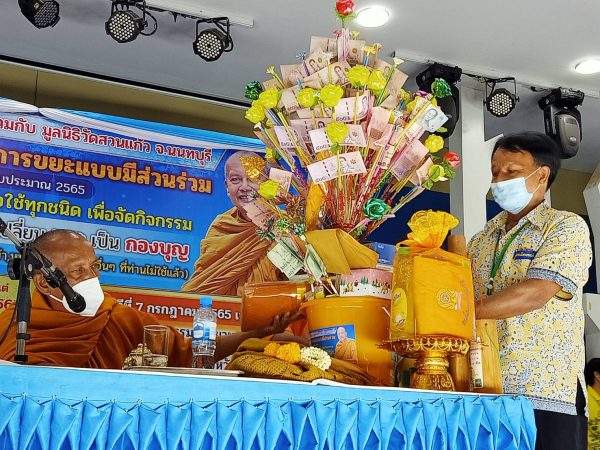 อาทิ เครื่องใช้ไฟฟ้า เฟอร์นิเจอร์ เสื้อผ้า รองเท้า หนังสือพิมพ์ จักรยาน ฯลฯ มาร่วมทำบุญและมอบให้กับวัดสวนแก้ว และภายในงานทาง พระราชธรรมนิเทศ พระพยอม กลฺยาโณ พระนักเทศน์ชื่อดัง ได้บรรยายธรรมและการจัดการขยะ มีใจความว่า ปัจจุบันขยะมีเป็นจำนวนมากและมีเพิ่มมากยิ่งขึ้น ปล่อยทิ้งกว้างไปก็จะทำให้มีความสดปรก ไม่เจริญหูเจริญตา อย่างที่จังหวัดเชียงใหม่ แหล่งท่องเที่ยวได้มีขยะปล่อยทิ้งจำนวนมาก และมีหนอนเต็มไปหมด ส่งผลทำให้นักท่องเที่ยวห่างหายไปหมด ขยะและสิ่งของเหลือใช้ไม่ควรจะปล่อยทิ้งไป สามารถจะนำเอากลับมาใช้ให้เกิดประโยชน์ใหม่ได้ ขยะสามารถนำเอามารีไซเคิล ทำให้เป็นเงินเป็นทองได้ ที่วัดสวนแก้วนำเอาขยะที่ไม่ใช้แล้ว และสิ่งของเก่าๆ มารีไซเคิล มาทำให้เกิดประโยชน์ได้ทั้งหมด ใครไม่มีงานทำ หรือ คนตกงาน ก็ให้เข้ามาทำงานที่วัด มีงานให้ทำเกี่ยวกับขยะรีไซเคิล หรือ สิ่งของเหลือใช้แล้ว นอกจากนี้แล้วยังให้ได้เข้ามาทำงานเป็นเกษตรกร ทำสวน ปลูกต้นไม้ ในเวลานี้ทางวัดมีเนื้อที่จำนวนมาก