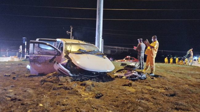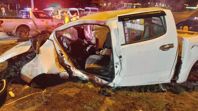 ซิ่งรถยนต์กระบะพุ่งชนราวปูนกั้นยูเทรินเหินชนเสาไฟฟ้าแรงสูงเหล็กที่ตั้งอยู่เกาะกลางจนรถพังยับมีคนติดอยู่ภายใน1ราย กู้ภัยต้องโร่ใช้เครื่องตัดถ่างช่วย