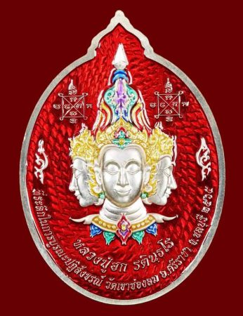 ด้านล่างเป็นดอกบัว สื่อถึงการสักการะนอบน้อมพระพุทธพระธรรมพระสงฆ์ ด้านหลังองค์พระพรหมสี่หน้าผู้บันดาลสร้างโลกเมตตากรุณา มุทิตา อุเบกขา ซึ่งได้ทำการพุทธาภิเษกเดี่ยวโดยหลวงปู่ฮกไปแล้วในวาระแรกที่วัดราษฏร์เรืองสุข(มาบลำบิด)ซึ่งในพิธีได้เกิดปาฏิหารมีพระอาทิตย์ทรงกลดเกิดขึ้นด้วย ซึ่งในพิธีที่วัดเขาช่องลมในวันที่ 24 ก.ค.2565 นี้จะมีพระเกจิคณาจารย์มีชื่อเสียงโด่งดังทั้ง 4 ภาคร่วมปลุกเสกอธิษฐานจิตเหรียญเปิดโลกพรหมบันดาลทรัพย์ วัดเขาช่องลม โดยมี หลวงปู่ฮก รตินฺธโร วัดราษฎร์เรืองสุข (มาบลำบิด) พระราชมงคลวชิราทร (บุดดา ปัญญาธโร) เจ้าอาวาสวัดป่าใต้พัฒนาราม ต.โนนหมากเค็ง อ.วัฒนานคร จ.สระแก้ว พระเทพชลธารมุนี วัดบางพระวรวิหาร(พระอารามหลวง)อ.ศรีราชาจ.ชลบุรี พระภาวนาวิสุทธิโสภณ ( หลวงพ่อมหาสุรศักดิ์ อติสกฺโข ). เจ้าคณะจังหวัดสมุทรสงคราม. เจ้าอาวาสวัดประดู่ (พระอารามหลวง.)