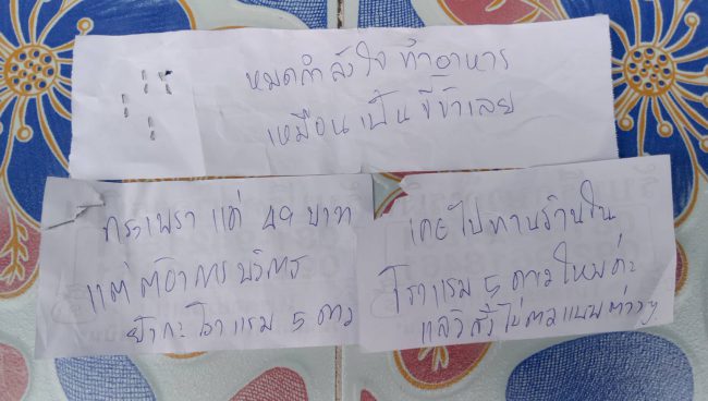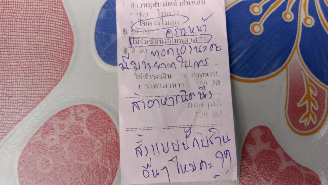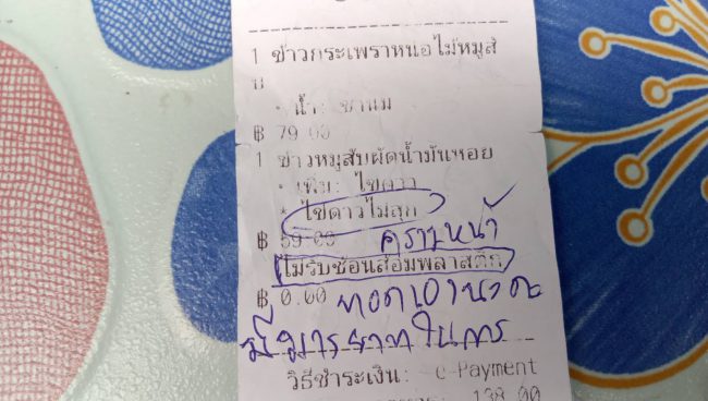แต่ปรากฏว่าเจอแม่ค้าเขียนด่าร่ายยาวมากับโน้ตและบิลค่าอาหารว่า “คราวหน้าทอดเองนะคะ มีมารยาทในการสั่งอาหารนิดหนึ่ง สั่งแบบนี้กับร้านอื่นๆ ไหมคะ เคยไปทานร้านในโรงแรม 5 ดาวไหมคะ แล้วสั่งไข่ดาวแบบต่าง ๆ กะเพราแค่ 49 บาท แต่ต้องการบริการอย่างกับโรงแรม 5 ดาวหมดกำลังใจทำอาหาร เหมือนเป็นขี้ข้าเลย