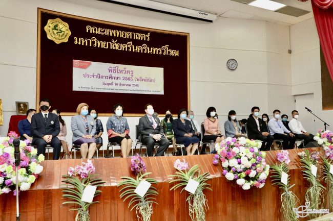 งานพัฒนาศักยภาพนิสิต คณะแพทยศาสตร์ มศว จัดพิธีไหว้ครู ประจำปีการศึกษา 2565 (พรีคลินิก) เพื่อให้นิสิตแพทย์ ได้แสดงความกตัญญูกตเวทีต่อคณาจารย์ เพื่อปลูกฝังความรู้คุณธรรมและจริยธรรม ซึ่งเป็นสิ่งสำคัญสำหรับการเป็นแพทย์ในอนาคต โดยมี รศ.ดร.สมชาย สันติวัฒนกุล อธิการบดีมหาวิทยาลัยศรีนครินทรวิโรฒ เป็นประธานในพิธีไหว้ครู และกล่าวให้โอวาทแก่นิสิตแพทย์ พร้อมทั้งศาสตราจารย์เกียรติคุณ ดร.ปานสิริ พันธุ์สุวรรณ รองอธิการบดีฝ่ายวิชาการ