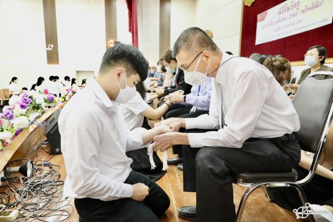 รักษาการแทนคณบดีคณะแพทยศาสตร์ มหาวิทยาลัยศรีนครินทรวิโรฒ กล่าวความรู้สึกที่มีต่อนิสิต ในการนี้ตัวแทนนิสิตแพทย์ชั้นปีที่ 2 – 3 ได้มอบพานดอกไม้ ธูปเทียน และพวงมาลัย แด่คณาจารย์ รวมถึงได้รับการผูกข้อมือรับพรจากคณาจารย์จากภาควิชาพรีคลินิก พร้อมทั้งมอบเกียรติบัตรแก่นิสิตแพทย์ที่มีผลการเรียนยอดเยี่ยม ประจำปีการศึกษา 2564 ซึ่งบรรยากาศเต็มไปด้วยความอบอุ่น ณ ห้องประชุม ชั้น 6 และห้องประชุม ชั้น 7 อาคารกายวิภาคศาสตร์ คณะแพทยศาสตร์ มศว ประสานมิตร 10 สิงหาคม 2565