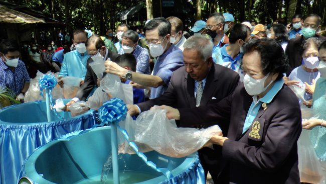 พร้อมเปิดโครงการปล่อยลูกกุ้ง-ลูกปลา คืนสู่ธรรมชาติ ครั้งที่ 7 โดยเชิญชวนข้าราชการพี้อมทั้งราษฎรในพื้นที่ปล่อยพันธุ์สัตว์น้ำ เป็นพันธุ์กุ้งกร้ามกรามจำนวน 2 ล้านตัว และพันธุ์ปลาน้ำจืด 1 ล้านตัว รวมทั้งสิ้น 3 ล้านตัว โดยมีนายอำพล อังคภากรณ์กุล ผู้ว่าราชการจังหวัดนครนายก พร้อมคณะ ให้การต้อนรับและกล่าวรายงาน ทั้งนี้เพื่อถวายเป็นพระราชกุศล เฉลิมพระเกียรติ รวมทั้งอนุรักษ์ทรัพยากรธรรมชาติทางน้ำและเพิ่มพูนปริมาณสัตว์น้ำในแหล่งน้ำให้มีความอุดมสมบูรณ์มากขึ้นต่อไป