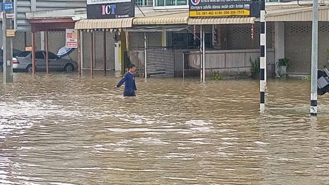 ฤทธิ์พายุทำฝนถล่มหนัก น้ำท่วมหนักหลายหมู่บ้านในพื้นอำเภอศรีราชา ท่วมสูงครึ่งเมตร รถเล็กไม่สามารถสัญจรผ่านได้