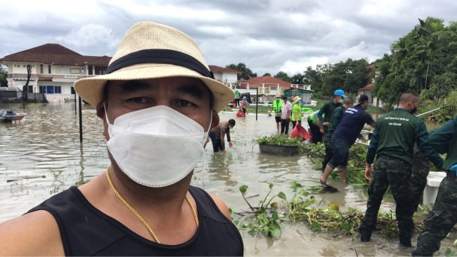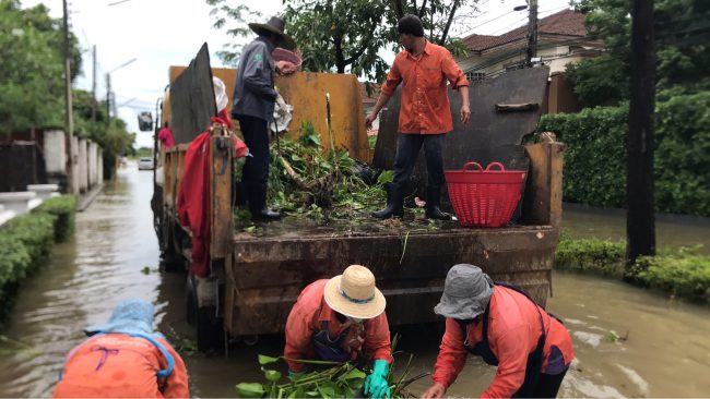 และหน่วยพระราชทานกองทัพบกมาช่วยเก็บผักตบชวาในคลอง และเก็บเศษขยะที่ขวางทางเดินน้ำเป็นจำนวนมากในหลายจุด และนายธนะพัฒน์ พันเฉลิมชัยโชค นายกเทศมนตรีเทศบาลนครเจ้าพระยาสุรศักดิ์ นำเจ้าหน้าที่ เทศบาลนครเจ้าพระยาสุรศักดิ์ มาอำนวยความสะดวกให้ประชาชนที่ใช้รถสัญจรไปมา ทั้งนี้คาดว่า หากฝนหยุดตกน้ำที่ท่วมก็น่าจะระบายลงสู่ทะเลได้ในเวลาไม่นานและเข้าสู่ภาวะปกติ แต่สิ่งที่จะตามมาก็คือขยะที่ไหลมากับน้ำที่ทางเจ้าหน้าที่ต้องเร่งทำการเก็บกวาดนั่นเอง