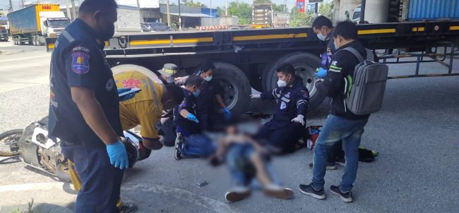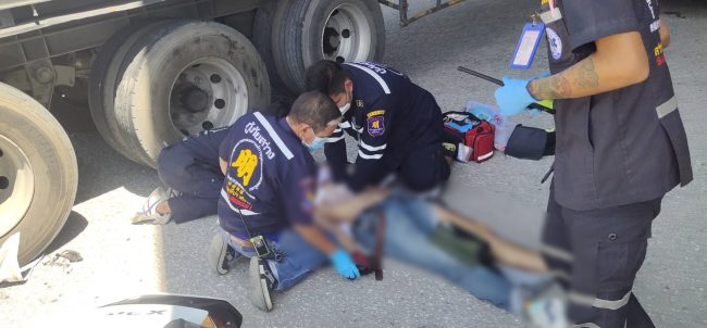 ที่เกิดเหตุพบผู้บาดเจ็บเป็นชายทราบชื่อคือนายเกียรติศักดิ์ อินสี อายุ 25 ปีใกล้กันพบรถจักรยานยนต์ honda PCX สีขาวหมายเลขทะเบียน 1กฐ2156 สระบุรี เลือดออกจมูก หมดสติ ได้รับบาดเจ็บสาหัส เจ้าหน้าที่หน่วยกู้ภัยได้ทำการปฐมพยาบาลเบื้องต้น ก่อนนำตัวส่งโรงพยาบาลสมเด็จพระบรมราชเทวี ณ ศรีราชา เพื่อให้แพทย์ทำการรักษาอย่างเร่งด่วน ส่วนรถคู่กรณีเป็นรถพ่วง 18 ล้อ ทะเบียน 716672 ระยอง สีขาวส่วนหางหมายเลขทะเบียน700937 ระยอง ด้านท้ายรถมีร่องรอยถูกเฉี่ยวชน โดยมีนายอภินันท์ จันทร์โส อายุ35ปีผู้ขับขี่รถบรรทุก