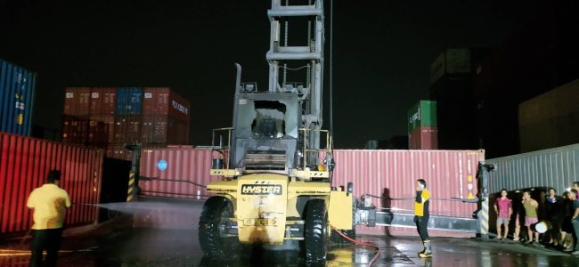 สอบสวนนายเสวก การุณ อายุ 40 ปี เป็นคนขับรถยกคันดังกล่าวให้การกับตำรวจว่าก่อนเกิดเหตุตนเองได้ขับรถยกตู้สินค้าเพื่อนำมากองเรียงใว้ที่บริเวณลานตู้ภายในบริษัทระหว่างที่ลำเลียงตู้สินค้าอยู่นั้นได้เกิดเสียงระเบิดขึ้นและมีเปลวไฟลุกขึ้นมาจากห้องเครื่องยนต์ที่อยู่ใต้คนขับเมื่อเห็นดังนั้นจึงได้หยิบเครื่องดับเพลิงที่ติดตั้งอยู่ในรถมาฉีดดับไฟแต่ไม่สามารถดับไฟได้เนื่องจากเพลิงได้ลุกลามไหม้ส่วนต่างๆของรถอย่างรวดเร็วจึงได้แจ้งให้เจ้าหน้าที่มาช่วยดับเพลิง แต่ไฟได้ใหม้ลุกลามตัวรถรวมทั้งเครื่องยนต์และระบบใฮดอริกเสียหายหมดทั้งคัน ส่วนสาเหตุคาคว่าจะมาจากความร้อนในห้องเครื่องจนทำให้เกิดไฟลุกใหม้ลามไปทั้งคัน ซึ่งค่าเสียหายในเบื้องต้นประมาณ 2 ล้านบาท
