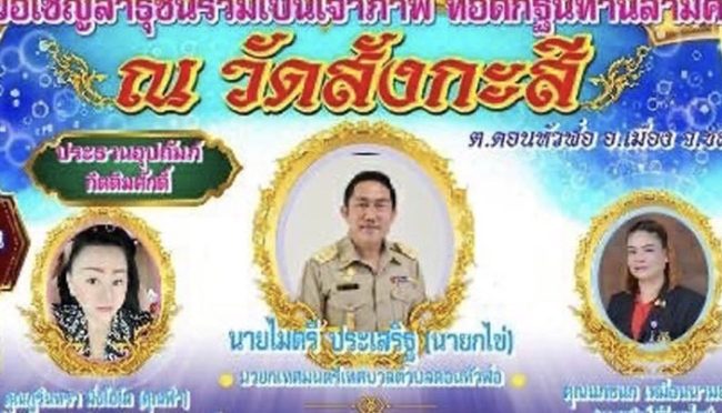 นายไมตรี (นายกฯไข่) ประเสริฐ นายกเทศมนตรีตำบลดอนหัวฬ่อ อ.เมือง จ.ชลบุรี น.ส.ภูรินทรา มิ่งโอโล เจ้าของร้านโรงเหล้าอมตะและเจ้าของธุรกิจหลายอย่างในพื้นที่ จ.ชลบุรี น.ส.นภชนก (เมย์) เหมือนนามอญ ที่ปรึกษาประจำคณะกรรมาธิการการคุ้มครองผู้บริโภคสภาผู้แทนราษฎร และผู้อำนวยการ สื่อออนไลน์(ชลนิวส์ทีวีออนไลน์ )ขอเชิญชวนญาติสนิทมิตรสหายและประชาชนทั่วไป ร่วมเป็นเจ้าภาพทอดกฐินสามัคคีที่วัดสังกะสี ต.ดอนหัวฬ่อ อ.เมือง จ.ชลบุรี ในวันที่ 6พฤศจิกายน 2565 เวลา 09.00 น.เป็นต้นไป