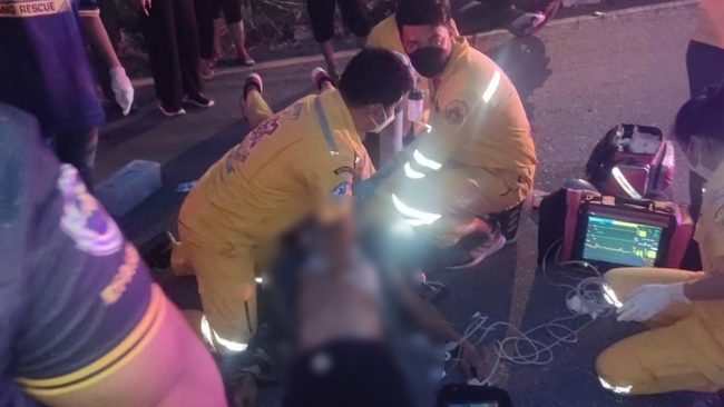 หนุ่มเบญจเพส ข้ามถนนไม่ทันระวัง เจอรถบรรทุกดิน พุ่งชนอัดร่างกระเด็นกระแทกพื้น หมดสติ กู้ภัยช่วยปั้มหัวใจยื้อชีวิต