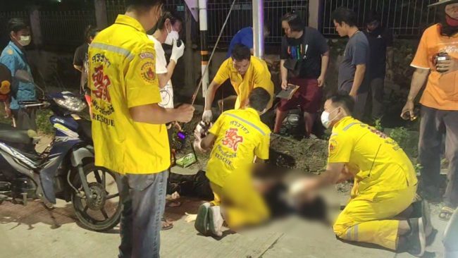 เมื่อเวลา20.45น.(20ต.ค.2565) ร.ต.อ.เรืองสิทธิ์ นาวีรัตนวิทยา รองสารวัตรสอบสวน สภ.บ่อวิน ได้รับแจ้งรถยนต์ชนรถจยย.ที่บริเวณแยกขนัมเจ็ด ถนนสายบ่อวิน-ยางเอน หมู่2 ตำบลบ่อวิน อำเภอศรีราชาหลังรับแจ้งจึงประสานศูนย์วิทยุหน่วยบรรเทาสาธารณะภัยและอุบัติภัยพุทธสมาคมเพียวเยี้ยงไท้ศรีราชา ส่งเจ้าหน้าที่อาสากู้ภัยเพียวเยี้ยงไท้ศรีราชาออกไปตรวจสอบ ตามที่รับแจ้งพบรถจยย.ยี่ห้อฮอนด้าสกู๊ปปี้ไอ สีเทาหมายเลขทะเบียน กฬ 7280-ชลบุรี ถูกรถมิตซูบิชิปาเจโร่ สปอร์ตชนท้ายพังทะเบียนหลุดจนพุ่งลงริมถนนช่วงแยกเข้าซอย โดยเจ้าของรถจยย.ที่ขี่มาชื่อนายสาธร เล้าศิริวัฒนา อายุ31ปี อาการสาหัส มีเลือดออกในช่องท้อง ทางอาสากู้ภัยต้องช่วยกันปฐมพยาบาลบาดแผลอย่างเร่งด่วน ก่อนรีบนำส่งโรงพยาบาลสมเด็จพระบรมราชเทวี ณ ศรีราชา ให้แพทย์ทำการรักษาอย่างเร่งด่วน