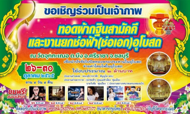 วัดจุกกะเฌอขอเชิญพุทธศาสนิกชนร่วมงานยกช่อฟ้า(ช่อเอก)พระอุโบสถและทอดกฐินสามัคคี ในวันที่ 30 ต.ค.นี้ พร้อมชมฟรีคอนเสิร์ตดังฉลองงานยกช่อฟ้า(ช่อเอก)พระอุโบสถ