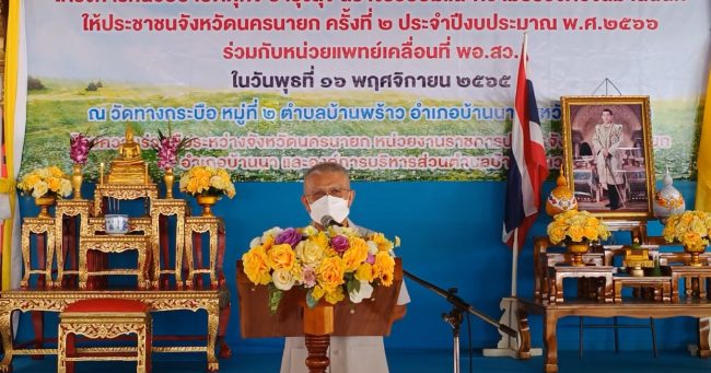 16 พฤศจิกายน 2565 ที่วัดทางกระบือ หมู่ที่ 2 ตำบลบ้านพร้าว อำเภอบ้านนา จังหวัดนครนายก นายอุดม เขตราษฎร์นุ้ย รองผู้ว่าราชการจังหวัดนครนายก รักษาการผู้ว่าราชการจังหวัดนครนายก เป็นประธานในพิธีเปิดโครงการบำบัดทุกข์บำรุงสุข สร้างรอยยิ้มและความปรองดองสมานฉันท์ให้ประชาชน เพื่อการรับรู้ข่าวสารและกิจกรรมต่างๆของหน่วยงานบริการให้กับประชาชนในอำเภอบ้านนา โดยมีนางวจิราพร อมาตยกุล นายอำเภอบ้านนา กล่าวรายงานและให้การต้อนรับพร้อมคณะ ซึ่งโครงกรดังกล่าวได้จัดขึ้นอย่างต่อเนื่อง โดยหมุนเวียนไปตามอำเภอ ตำบล หมู่บ้านต่างๆ ทั้งนี้เพื่อให้บริการประชาชนในพื้นที่ห่างไกล