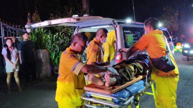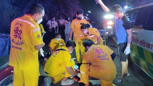 ได้ไปดื่มสุรากันมาแล้วกำลังขี่รถจยย.ยี่ห้อฮอนด้า สกู๊ปปี้ไอ สีเลือดหมู หมายเลขทะเบียน 2กพ-1255 ชลบุรี กำลังจะกลับบ้านด้วยความเร็ว ได้มีสุนัขวิ่งตัดหน้ารถ จึงได้ชนอย่างแรง จนรถจยย.ที่ขี่มาล้มลงศีรษะฟาดกับพื้นถนน จนศีรษะแตกเป็นบาดแผลใหญ่เลือดไหลไม่หยุด ทางอาสากู้ภัยเพียวเยี้ยงไท้ศรีราชาจึงได้ประสาน รถกู้ชีพลั่นทมโรงพยาบาลสมเด็จพระบรมราชเทวี ณ ศรีราชา ให้ส่งทีมแพทย์พยาบาลออกมาทำการช่วยเหลือผุ้บาดเจ็บและนำผู้บาดเจ็บส่งโรงพยาบาลพญาไทศรีราชาตามสิทธิการรักษา ให้แพทย์ทำการรักษาตัวต่อไป ส่วนสุนัขที่โดนชนได้วิ่งหลบหนีหายไปหลังจากโดนชนแล้ว