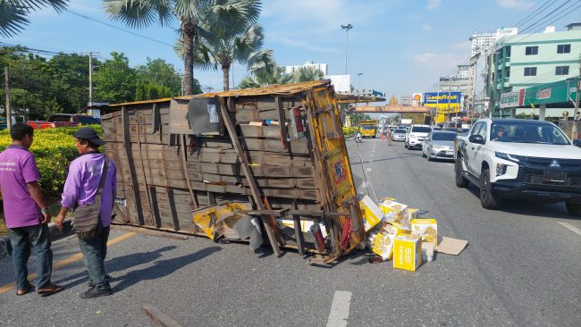 ชลบุรี-6 ล้อบรรทุกสินค้ากระบะหลุด พลิกคว่ำ ตกเกลื่อนถนน