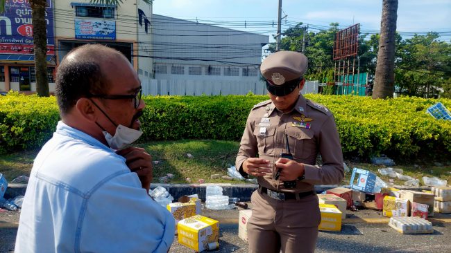 เมื่อเวลา 14.00 น.วันที่ 22 ธันวาคม 2565 พ.ต.ท.มาโนช เพรชประกอบ สว.สอบสวน สภ.บางละมุง จ.ชลบุรี รับแจ้งอุบัติเหตุ รถพ่วงหกล้อบรรทุกสินค้า พลิกคว่ำ ตกเกลื่อนถนน มีผู้ได้รับบาดเจ็บ เหตุเกิดบนถนนสุขุมวิท ด้านหน้าสถานีน้ำมัน ปตท. ต.นาเกลือ อ.บางละมุง จ.ชลบุรี หลังรับแจ้งจึงพร้อมด้วยกำลังเจ้าหน้ากู้ภัยสว่างบริบูรณ์ธรรมสถานเมืองพัทยารีบไปตรวจสอบ