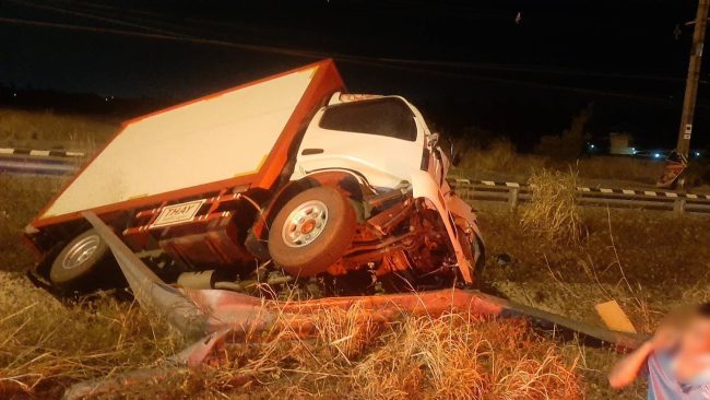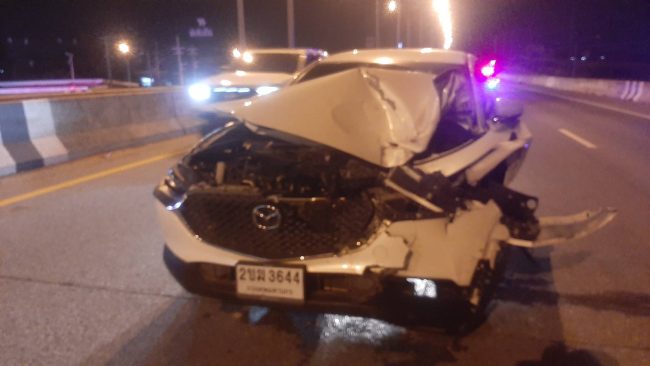 ชลบุรี-สภาพอย่างยับ เก่งขับพุ่งเสยท้ายรถบรรทุก เละไปเกือบครึ่งคัน