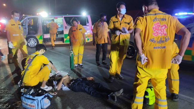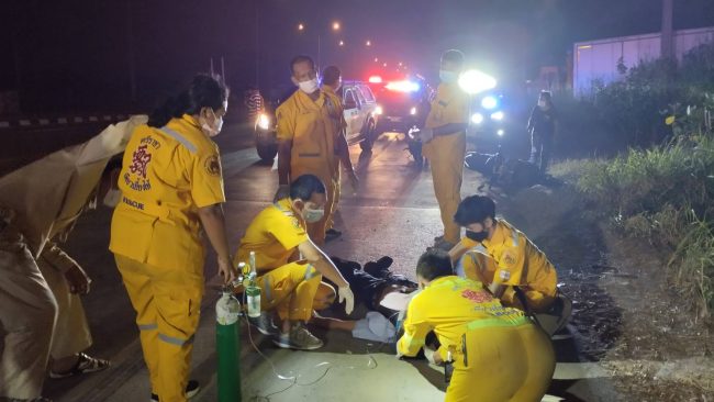 และประสานรถกู้ชีพลั่นทมโรงพยาบาลสมเด็จพระบรมราชเทวี ณ ศรีราชาให้ส่งทีมแพทย์และพยาบาลมาให้การช่วยเหลือเนื่องจากอาการสาหัสและมีบาดแผลที่ศีรษะเนื่องจากรถจยย.ยี่ห้อออนด้าเวฟ 125 สีน้ำเงิน หมายเลขทะเบียนป้ายแดง 6-2368 สภ.ศรีราชา ที่ผู้บาดเจ็บขี่มาตกร่องข้างถนนแล้วรถล้มคว่ำร่างผู้บาดเจ็บไถลไปจากรถจยย.ที่ล้มคว่ำ 30 เมตร ตรวจสอบที่กระเป๋าพบบัตรพนักงานโรงงานในนิคมอุตสาหกรรมปิ่นทอง2 ระบุชื่อนายอภิศักดิ์(ขอสงวนนามสกุล)อายุประมาณ 30 ปี ตามตัวยังมีร่องรอยบาดแผล หลังจากนั้นทางอาสากู้ภัยจึงปฐมพยาบาลให้ออกซิเจนรอรถกู้ชีพลั่นทมมารับเมื่อมาถึงทางทีมแพทย์พยาบาลจึงเข้าตรวจสอบและปฐมพยาบาลต่อก่อนนำตัวส่งโรงพยาบาลพญาไทศรีราชาให้แพทย์ทำการรักษาอาการบาดเจ็บต่อไป