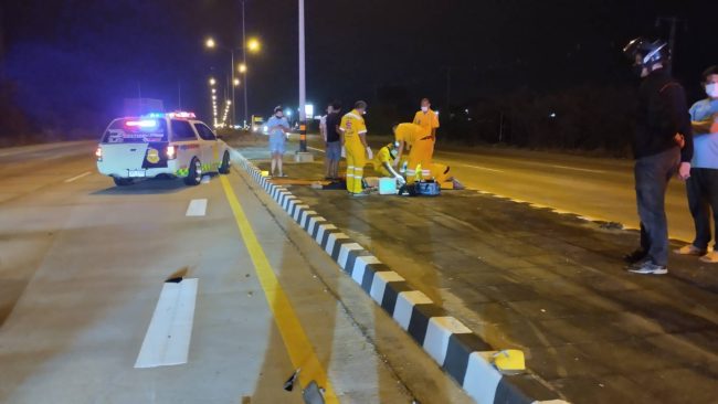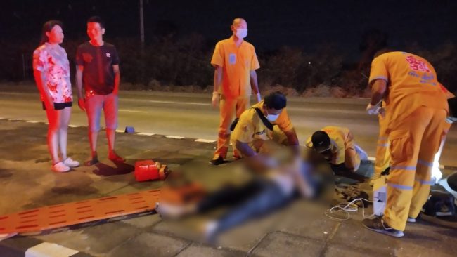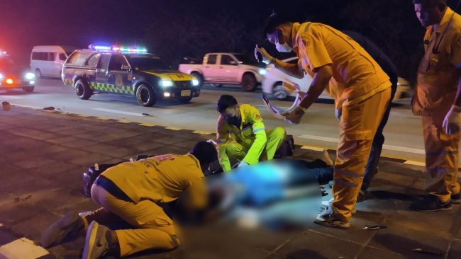 ซิ่งรถจยย.ชนฟุตบาทเกาะกลางถนนร่างกระเด็นลอยตกกลางฟุตบาทหมดสติปลุกไม่ตื่น