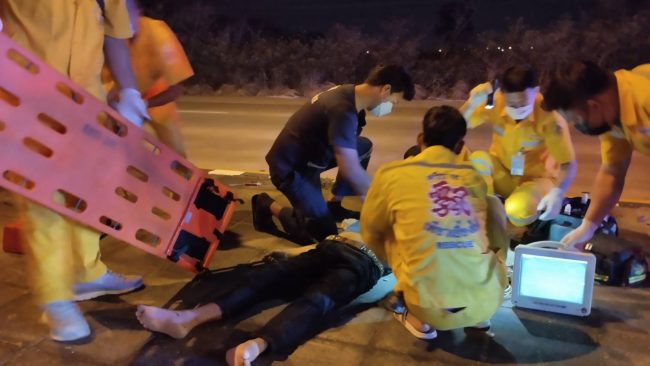 เมื่อเวลา21.20น.(18ม.ค.2566) อาสากู้ภัยเพียวเยี้ยงไท้ศรีราชา ได้รับแจ้งมีรถจักรยานยนต์ชนฟุตบาทเกาะกลางถนน ร่างกระเด็นลอยไปอยู่กลางฟุตบาท เลยไฟแดงมาบบอน ไปทางมาบเอียง 100 เมตร พื้นที่หมู่8 ตำบลบ่อวิน อำเภอศรีราชา จังหวัดชลบุรี หลังรับแจ้งจึงเดินทางไปตรวจสอบพบร่างของชายไทยอายุประมาณ 30 ปีนอนหงายอยู่ที่เกาะกลางถนนหมดสติ ปลุกไม่ตื่น ทางอาสากู้ภัยจึงช่วยกันกระตุ้นปลุกให้ตื่น โดยใช้เวลา 15 นาที จึงมีสติแต่ไม่ตอบสนองด้านคำพูด มีกลิ่นสุราร่วม