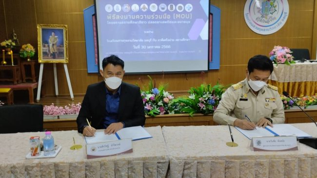 เมื่อเวลา09.00น.ของวันที่30 ม.ค.2566ที่ห้องประชุมภายในโรงเรียนสวนกุหลาบวิทยาลัยชลบุรี ได้จัดให้มีพิธีลงนามบันทึกข้อตกลง (MOU) โครงการสถานศึกษาสีขาวปลอดยาเสพติด และอบายมุขในปัจจุบันปัญหายาเสพติดเป็นปัญหาสำคัญของสังคม โดยเฉพาะการแพร่ระบาดในกลุ่มเยาวชน ซึ่งเป็นกลุ่มเสี่ยงสูงต่อการใช้ยาเสพติด รวมถึงปัญหาการดื่มเครื่องดื่มแอลกอฮอร์ การสูบบุหรี่ ปัญหาสื่อลามกอนาจาร การพนัน และการทะเลาะวิวาท นับวันจะยิ่งลุกลามในสังคมไทยในปัจจุบัน โดยหน่วยงานทางการศึกษาที่รับผิดชอบในการบริหารจัดการศึกษาขั้นพื้นฐาน ได้ตระหนักและให้ความสำคัญกับปัญหาดังกล่าวเป็นอย่างยิ่ง เขตพื้นที่การศึกษาซึ่งรับผิดชอบด้านผู้เรียน เป็นการพัฒนานักเรียนให้มีคุณลักษณะที่พึงประสงค์ เป็นคนที่สมบูรณ์ทั้งร่างกายและจิตใจ สามารถอยู่ร่วมกับผู้อื่นได้อย่างมีความสุข
