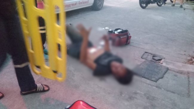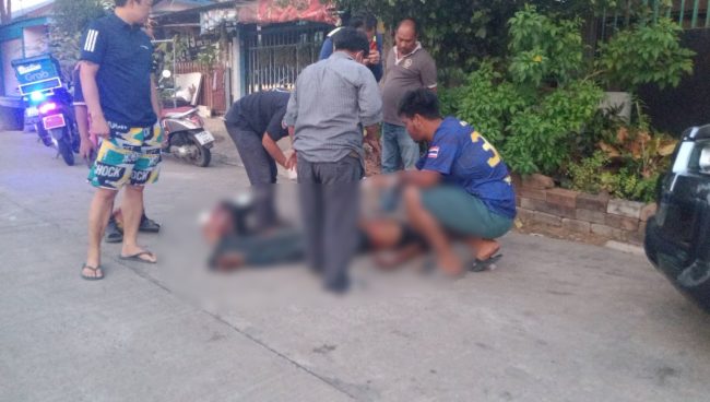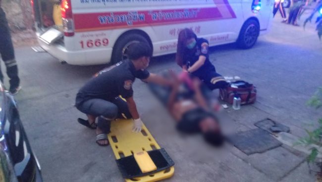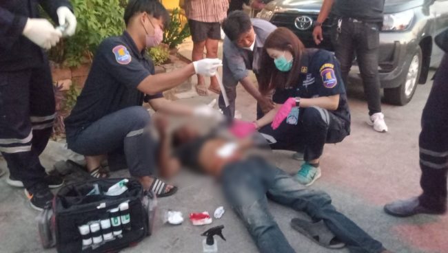 ที่เกิดเหตุพบร่างชายนอนได้รับบาดเจ็บอยู่ภายในซอยและอยู่ในอาการมึนเมาสุรา โดยบริเวณหน้าท้องมีบาดแผลถูกมีดแทงประมาณ 4 รู และมีเลือดไหลออกมาจำนวนมาก ทราบชื่อต่อมาคือนายสมชาย สนธิใหม่ อายุ 54 ปี และเมื่อทางเจ้าหน้าที่กู้ชีพพร้อมรถพยาบาลและอาสาสมัครมาถึงจึงได้รีบเข้าทำการปฐมพยาบาลและปิดบาดแผลให้ผู้ได้รับบาดเจ็บก่อนทำการนำตัวส่งรักษาต่อที่โรงพยาบาลสมเด็จพระบรมราชเทวี ณ ศรีราชา