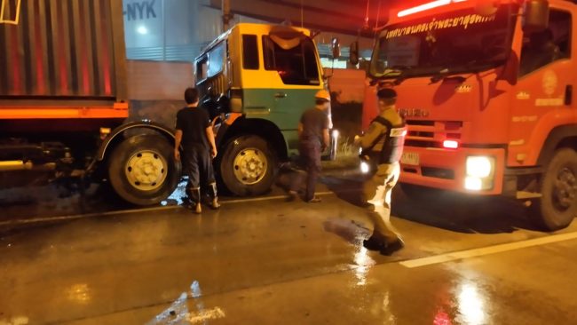 ซึ่งทางอาสาหน่วยกู้ภัยต้องนำรถไปปิดถนนไม่ให้รถวิ่งผ่านเนื่องจากเปลวเพลิงลุกโหมกระหน่ำอย่างรุนแรง ซึ่งกว่ารถดับเพลิงจากเทศบาลนครเจ้าพระยาสุรศักดิ์จะเดินทางมาถึงและใช้เวลาดับเพลิงที่กำลังโหมลุกไหม้รถและตู้คอนเทรนเน่อร์นานกว่า 20 นาทีเพลิงจึงสงบลง โดยทำให้หัวรถพ่วง 22 ล้อ ยี่ห้อฮีโน่ หมายเลขทะเบียน 73-7023 ชลบุรี ส่วนพ่วง71-0172 ชลบุรี และตู้คอนเทรนเน่อร์ 1 ตู้ ได้รับความเสียหายและสินค้าที่บรรทุกมาเป็นนมกล่องชื่อดังได้รับความเสียหาย ซึ่งความเสียหายในครั้งนี้กว่า 1 ล้านบาท