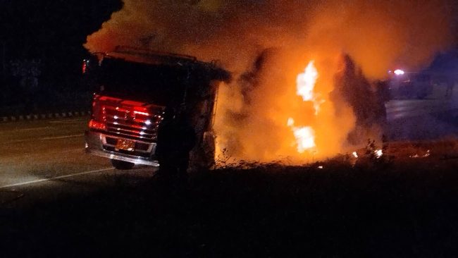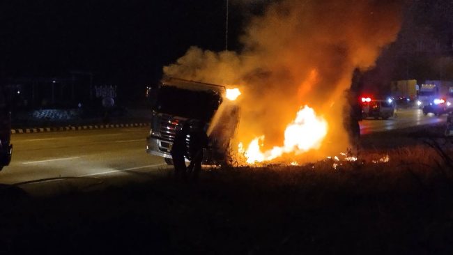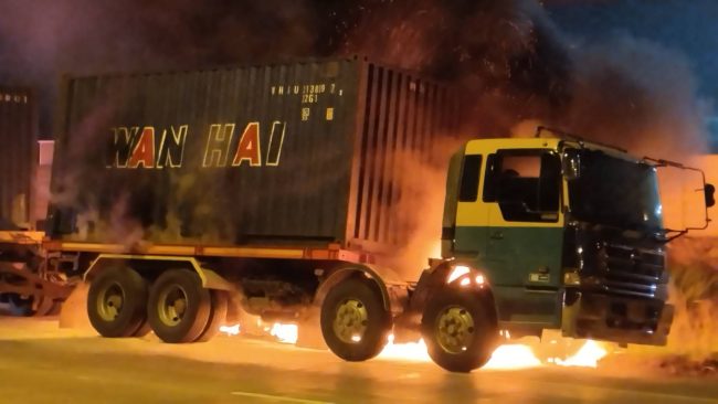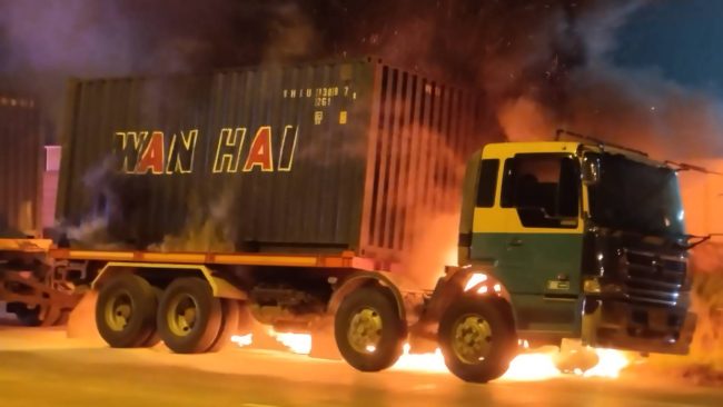 ไฟไหม้ยางรถที่ระบิดก่อนลามไปติดหัวรถพ่วง 22 ล้อ และลามไปติดตู้คอนเทรนเน่อร์ที่บรรทุกนมยี่ห้อดังเสียหายไป 1 ตู้