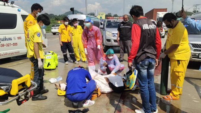 ฝนตกถนนลื่นสิบล้อกลับรถกระทันหันทำให้หนุ่มสาวควบบิ๊กไบค์คู่ใจพุ่งเสยท้ายรถบรรทุก10ล้อ เจ็บ…